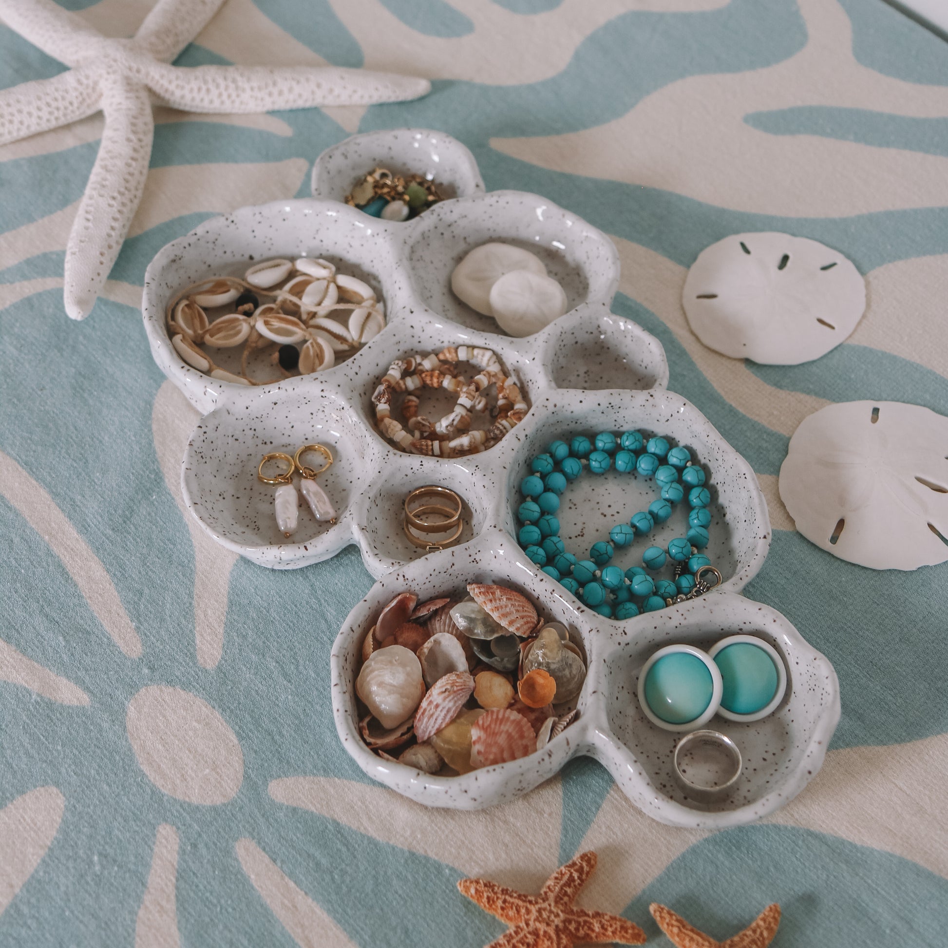 It all started because I’m not a fan of my foods touching (charcuterie boards stress me out!), so I came up with this design as a solution. When it came out of the kiln, I was instantly obsessed and knew I couldn’t let it sit in the cupboard most of the year—so it quickly became my go-to jewelry dish!